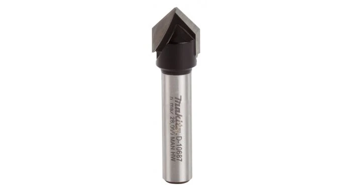 Hardmetalen V-groeffrees. Geschikt voor het kopiëren van snijwerk, graveerwerkzaamheden, verfraaiingen in massief hout, lijmhoudende houtsoorten zoals MDF, spaanplaat en kunststoffen.