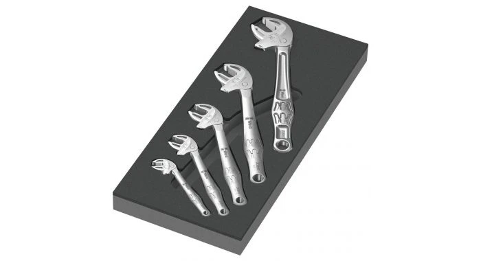 Duurzaam schuimrubberen inzetstuk; tweekleurig voor snelle identificatie van ontbrekende onderdelen; passend bij de Tool Rebel gereedschapswagen; voorzien van 5 zelfinstellende Wera 6004 Joker steeksleutels.